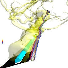 Axonal trajectories, created in terms of splines either using the GUI CAD features or numerically using the Python interface can be positioned in the relevant structures (i.e., fascicles) according to user-defined rules (number of axons, length, displacement, etc.) or following realistic nerve trajectories in computational human models. They can be created as well as random spline trajectories within specified entities (for example within fascicles) using the Sim4Life IMSafe tool for implant safety evaluations.