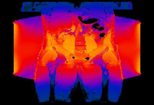 In vivo EM induced heating, both transient and steady state, is simulated with the P-THERMAL module. It is based on the Pennes Bioheat equation and accounts for metabolic and EM heat sources, heat diffusion, and heat transfer by tissue perfusion, with functionality to consider local thermoregulation by vasodilation as well as body core temperature increase over time. Convective surface cooling by external and internal air or a heated/cooled water-bolus in contact with the skin as well as the influence of large vessels in the treatment region can be included. Again, the Sim4Life tissue properties database includes thermal and perfusion parameters for a wide range of tissues.