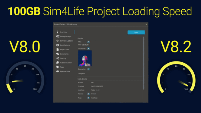 Significant speed enhancement: Comparison of Sim4Life V8.0 and V8.2 load times on the web for a project containing 100 GB of data, which is typical for complex, high-resolution studies. Thanks to the caching and buffering capability of our proprietary Elastic File System (EFS), the project loads and is ready to be used more than 7 times faster with V8.2.