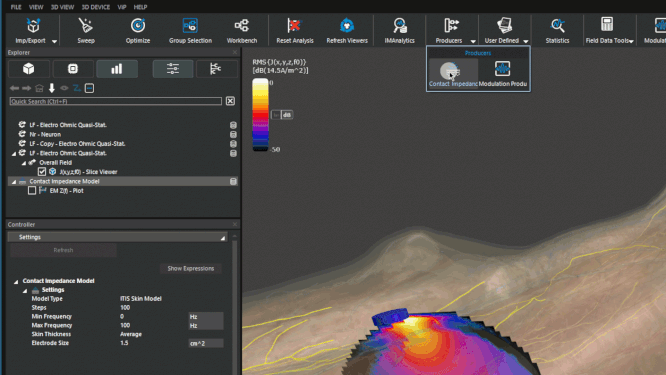 Electrostimulation: Four distinct parameterized contact impedance models, each with adjustable parameters, are available in Sim4Life V8.2. These models can be integrated with excitation pulses applied to neuron or thermal simulations, functioning as a temporal modulation of a low-frequency electric field.