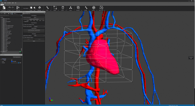 Cage-based morphing (free-form deformation technique) allowing to modify the shape and size for multiple model entities: use of the new cage-based morphing tool on the heart and blood vessels of the Duke v3.1 model, creating a deformed version of the anatomy without holes or gaps between the tissues. Complex deformation fields (e.g. breathing, beating heart) can be loaded through a dedicated Python API.