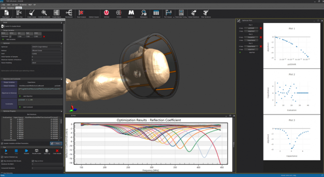 The novel optimization framework allows for multi-parameter and multi-goal optimizations with real-time visualization of the results. In this example, the capacitance values of a 7T MRI birdcage coil are optimized. The reflection coefficient is minimized at 298 MHz while the SAR in the head region is maintained below a specified limit.